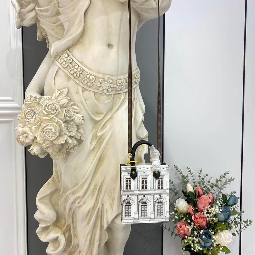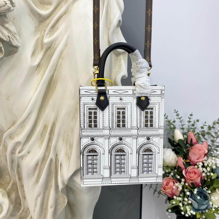 This Architettura special edition of the iconic Petit Sac Plat was inspired by Artistic Director Nicolas Ghesquière's collaboration with the Italian artistic design atelier Fornasetti, renowned for its remarkable optical illusions. It is crafted from patent calf leather evoking the finish of Fornasetti ceramics and printed with the fa?ade of a Palladian-style palazzo. This elegant, slim-line bag features double handles and a removable shoulder strap.