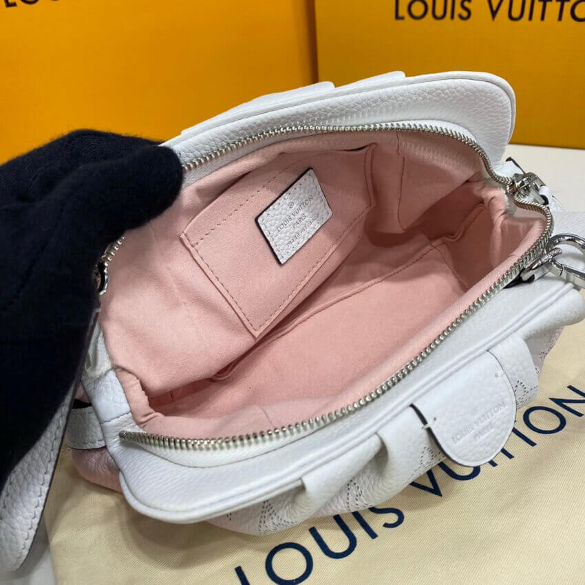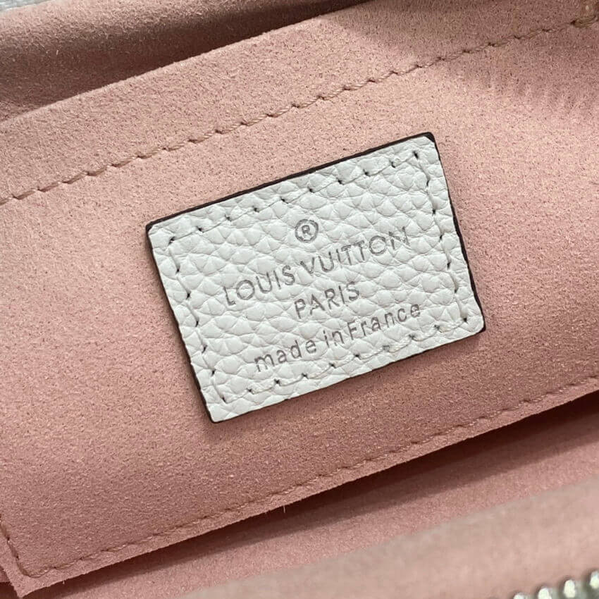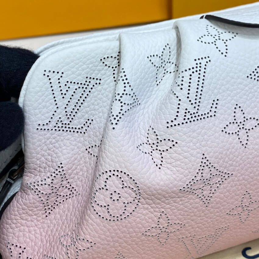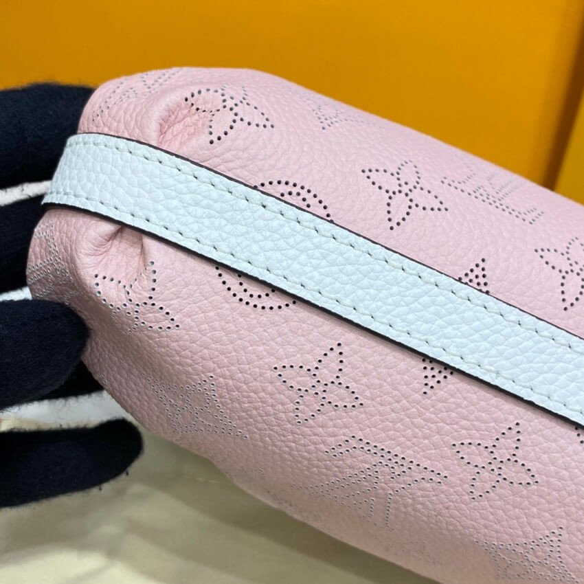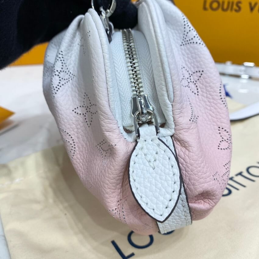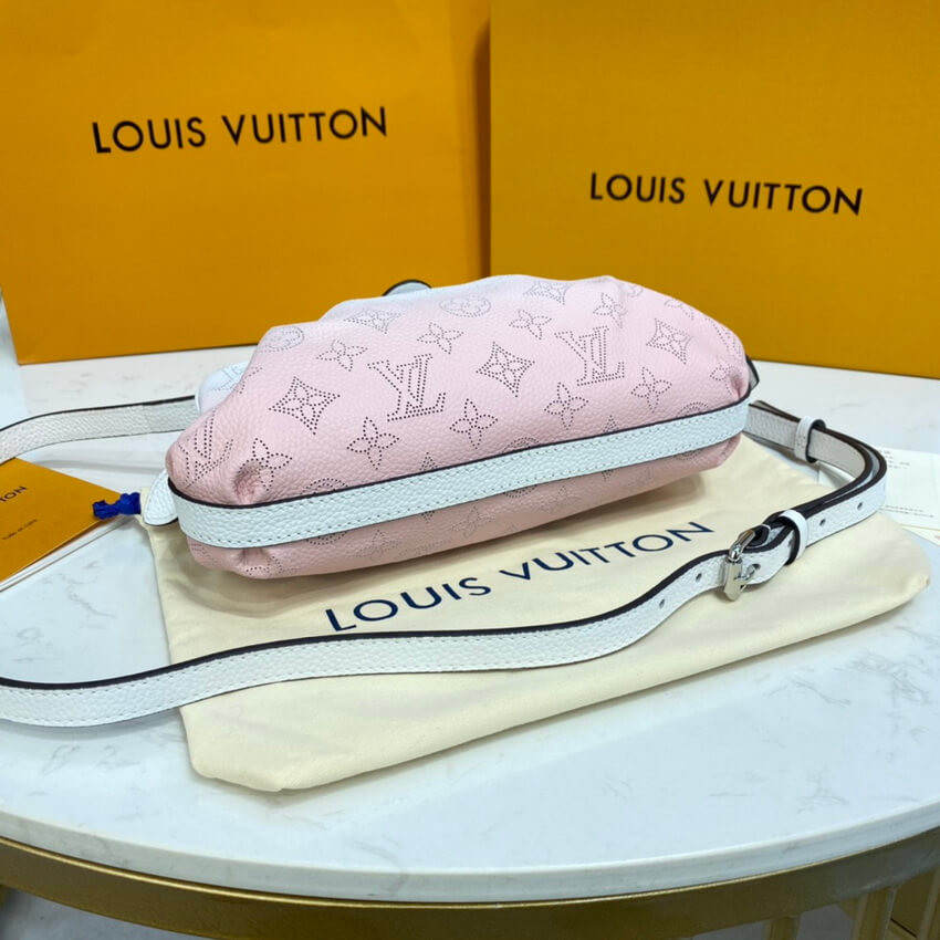 The Scala mini pouch is crafted from supple Mahina calf leather, characterized by its delicate, Monogram-pattern perforations. A subtle color gradation and a contrasting lining add to the refinement of this design, whose soft shape was inspired by the folds of drapery. With its removable, adjustable strap, this bag can be carried in different ways.