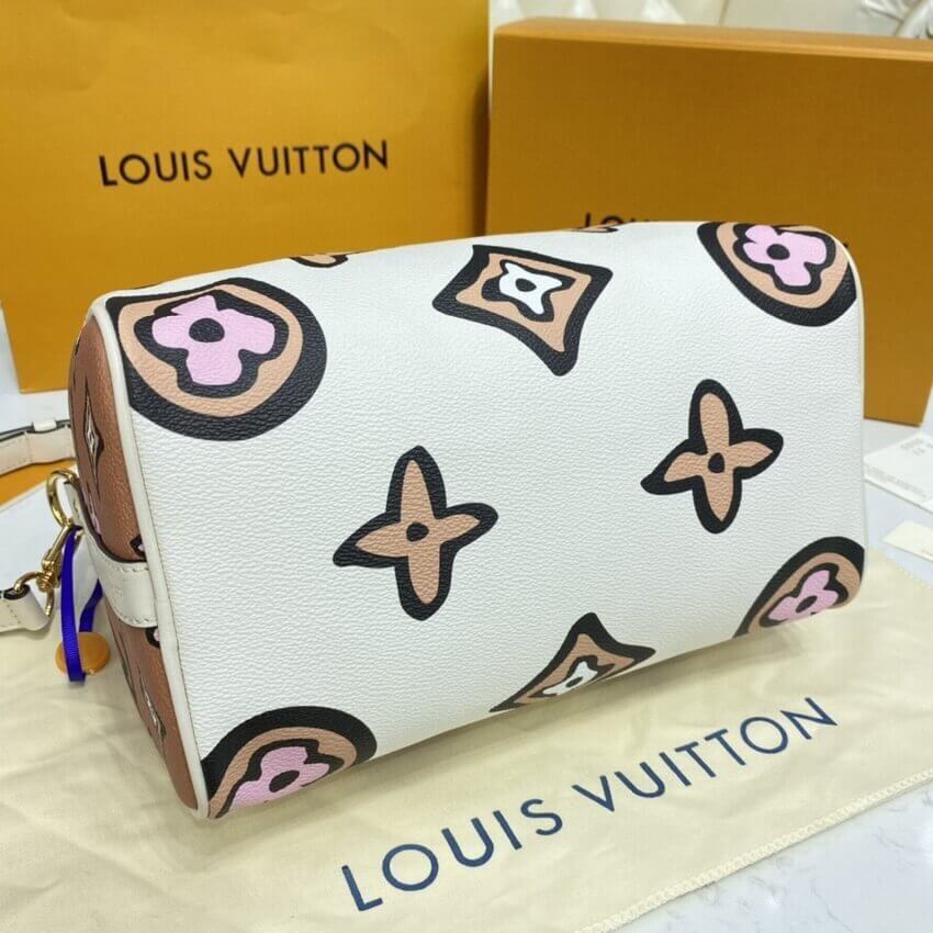 This Speedy Bandoulière 25 handbag comes from the Fall 2021 Wild at Heart capsule. The classic shape is dressed in an exclusive Monogram print with a striking hand-painted look, inspired by an archival House motif from 1924. Because they play out as neutrals, the bag's luminous autumnal colors create a stylish complement for the season’s silhouettes.