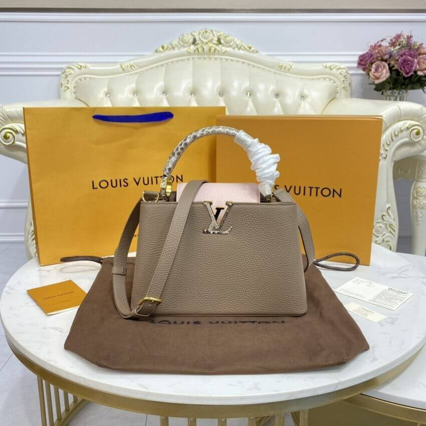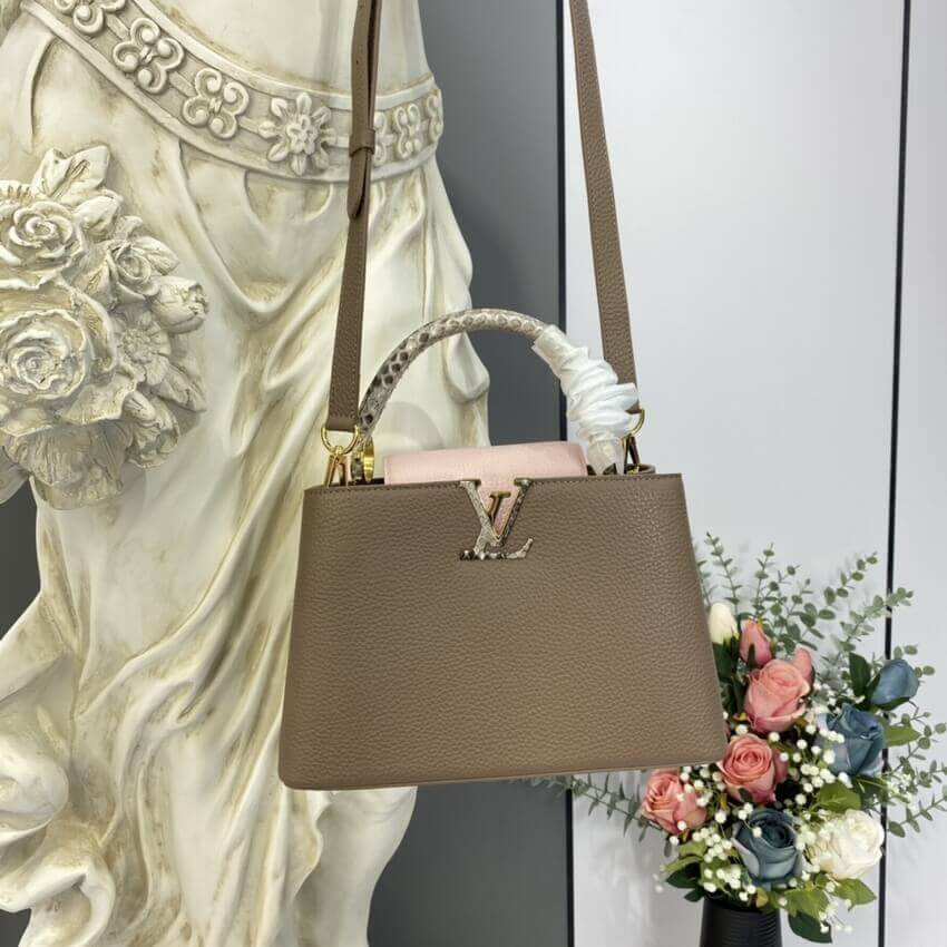 This season, an elegant new colorway comes to the Capucines BB handbag: a delicate combination of soft tones, enhanced by exotic ayers leather on the handle and the LV signature. The top handle and wide removable strap deliver multiple carry options. A sophisticated look for day or evening.