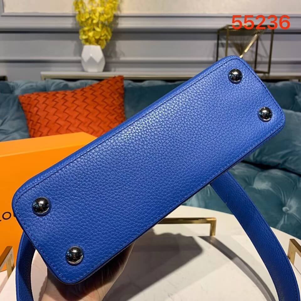 The youthful Capucines BB handbag in supple Taurillon leather takes a playful feel with its braided handle and strap. Made of contrasting leather threads, the braid bring an arts and crafts feel to this iconic bag for Fall 2019. The bag can be carried with the flap out or tucked inside to reveal the silver-color LV Initials.