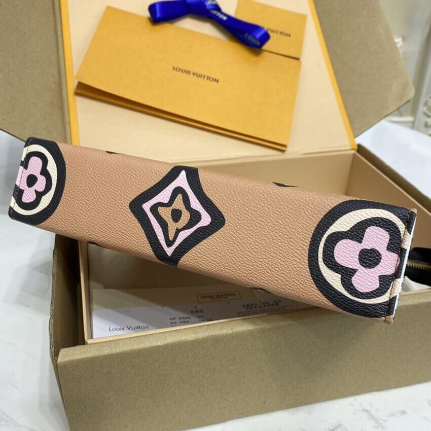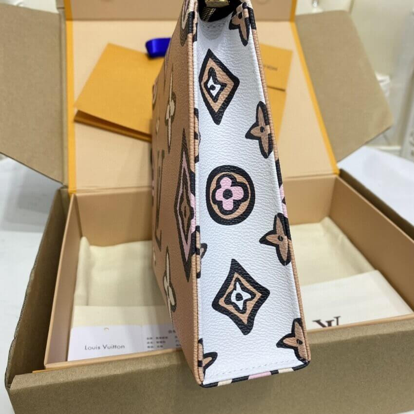 This Toiletry Pouch 26 is fashioned from canvas from an extra large version of the Monogram motif that seems to have been drawn by hand. Inspired by a treatment of the Monogram pattern seen on the cover of a product catalogue from 1924, it brings a handcrafted feel to this toiletry pouch with its gusseted sides.