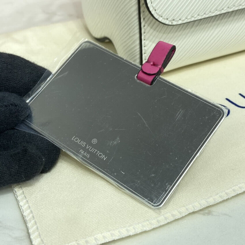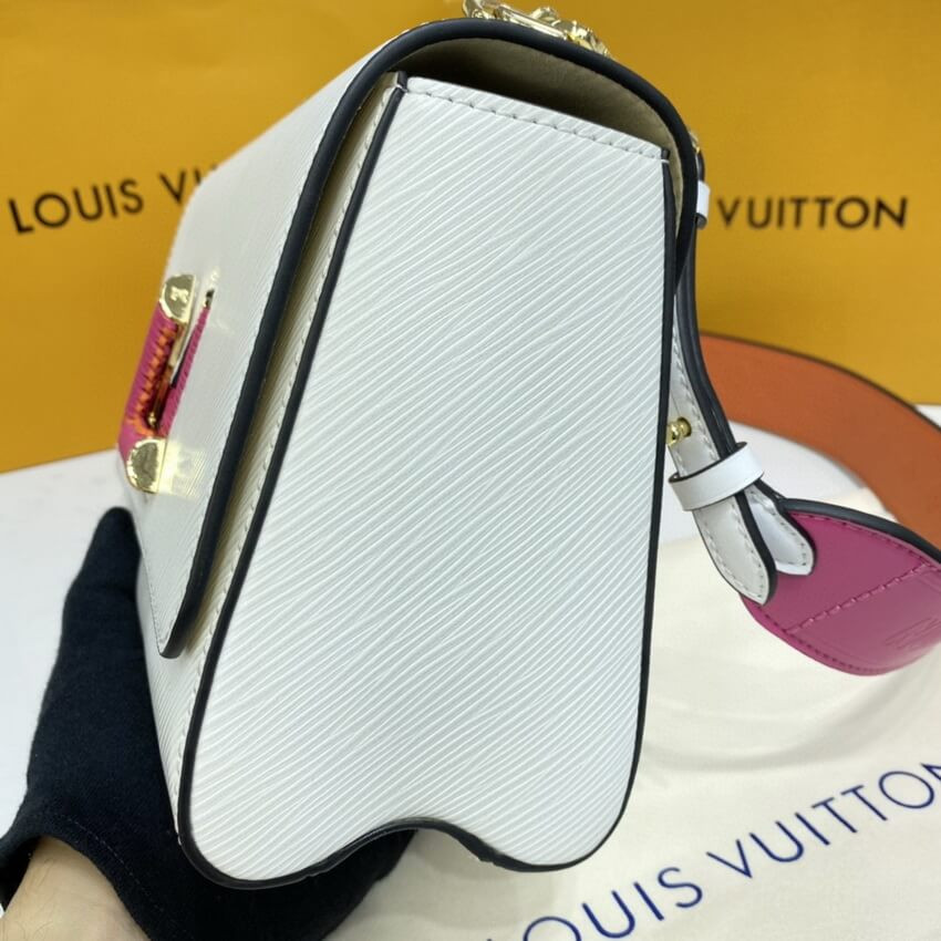 Louis Vuitton spices up the emblematic Twist MM handbag with bicolor leather braiding on the LV Twist lock and three-color leather strap. The wide strap features a debossed Louis Vuitton signature on one side, and an embossed mini Monogram motif on the other. A gold-color chain handle enables hand and elbow carry.
