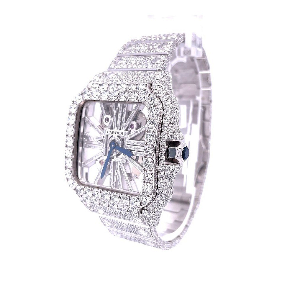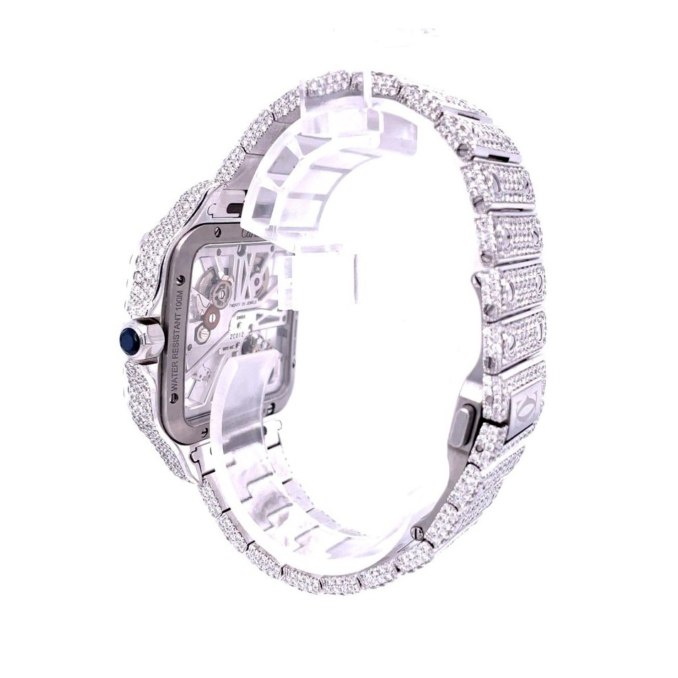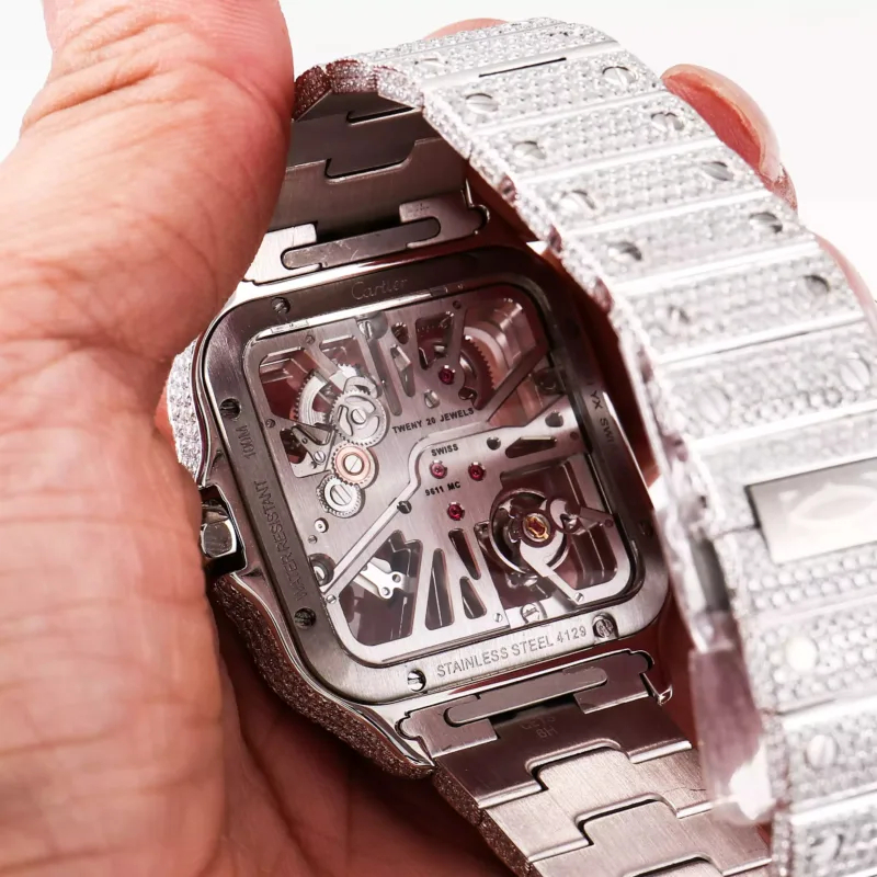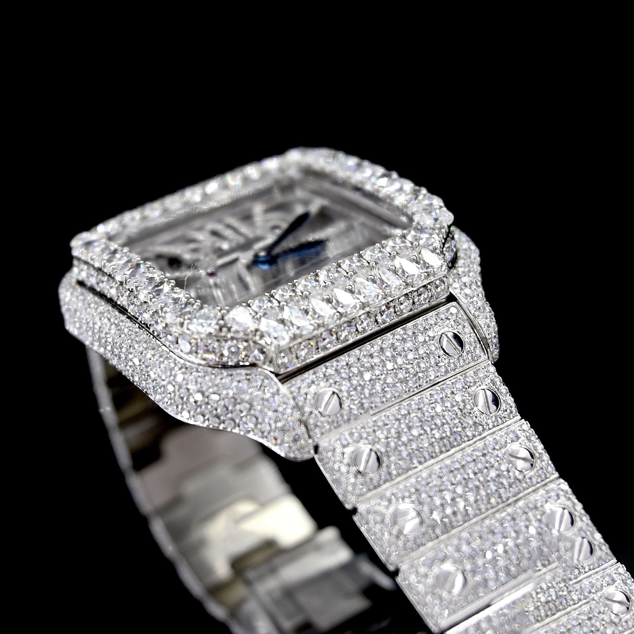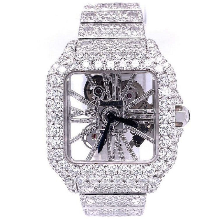 We use Rhinestone or Zircon for our iced out watches, and all our diamond watches feature high-quality movement with a super clone standard. If you prefer real moissanite, the watch will cost $3000-4000 and will pass testing with cert.