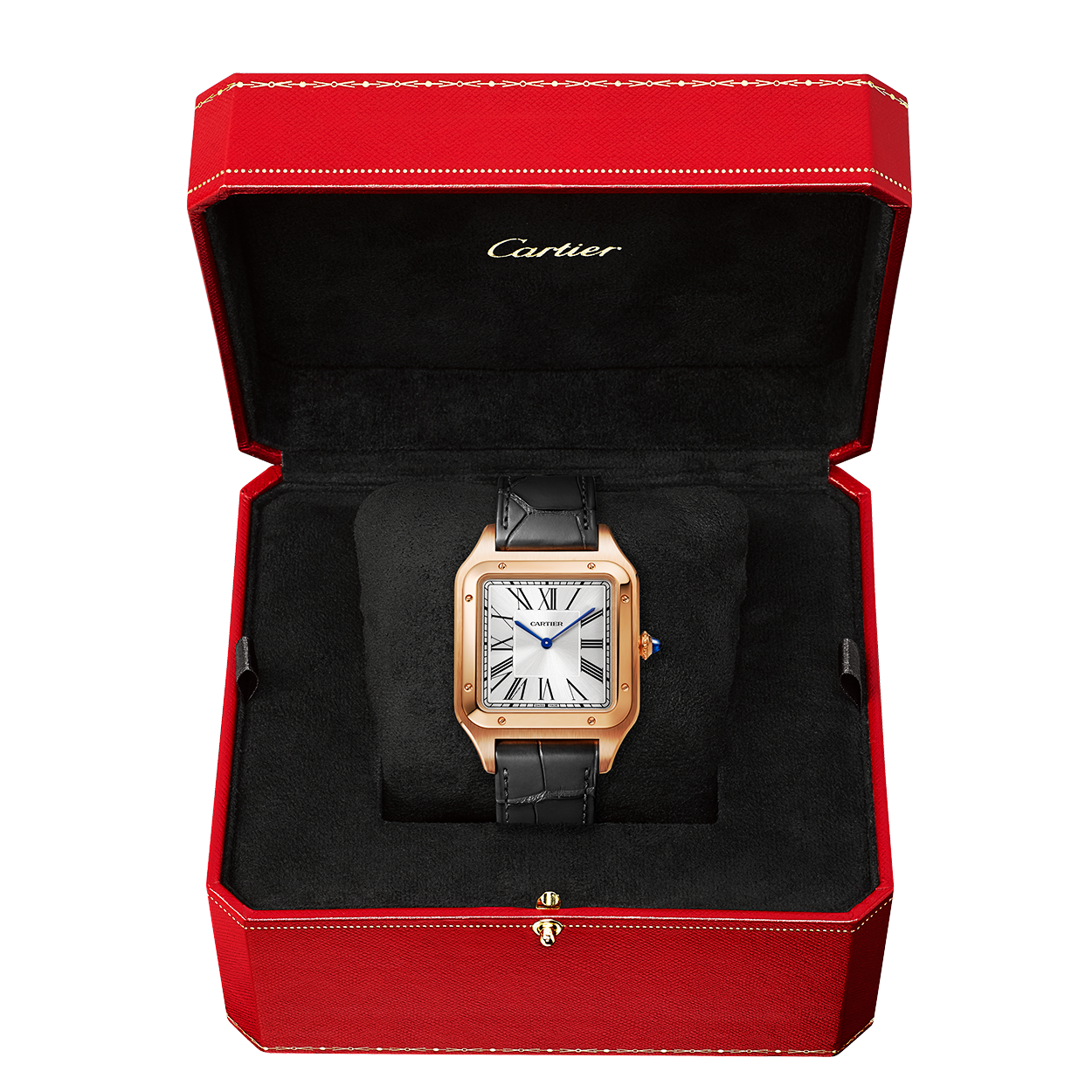 Cartier Santos Dumont 18ct Rose Gold Extra-Large Strap Watch WGSA0032. 18ct rose gold 46.6mm x 33.9mm case and bezel all on a gray alligator leather strap. This men's watch has a satin-brushed silver dial with black roman numerals and blued steel hands. Water resistant up to 30m and sapphire crystal glass. Manual winding movement.