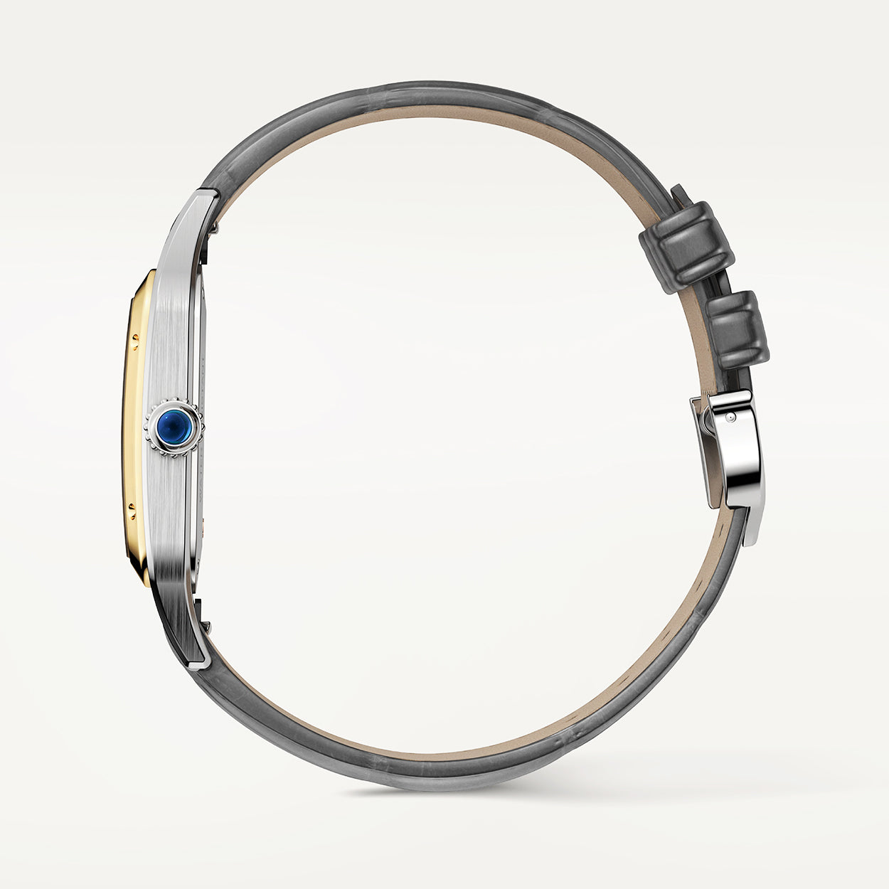 Cartier Santos Dumont Large Steel & 18ct Yellow Gold Strap Watch W2SA0028. Stainless steel & 18ct yellow gold 43.5mm x 31.4mm case and bezel all on a grey leather strap. This men's watch has a grey dial with golden hands and hour numerals. Sapphire crystal glass and water resistant up to 30m. Quartz movement.