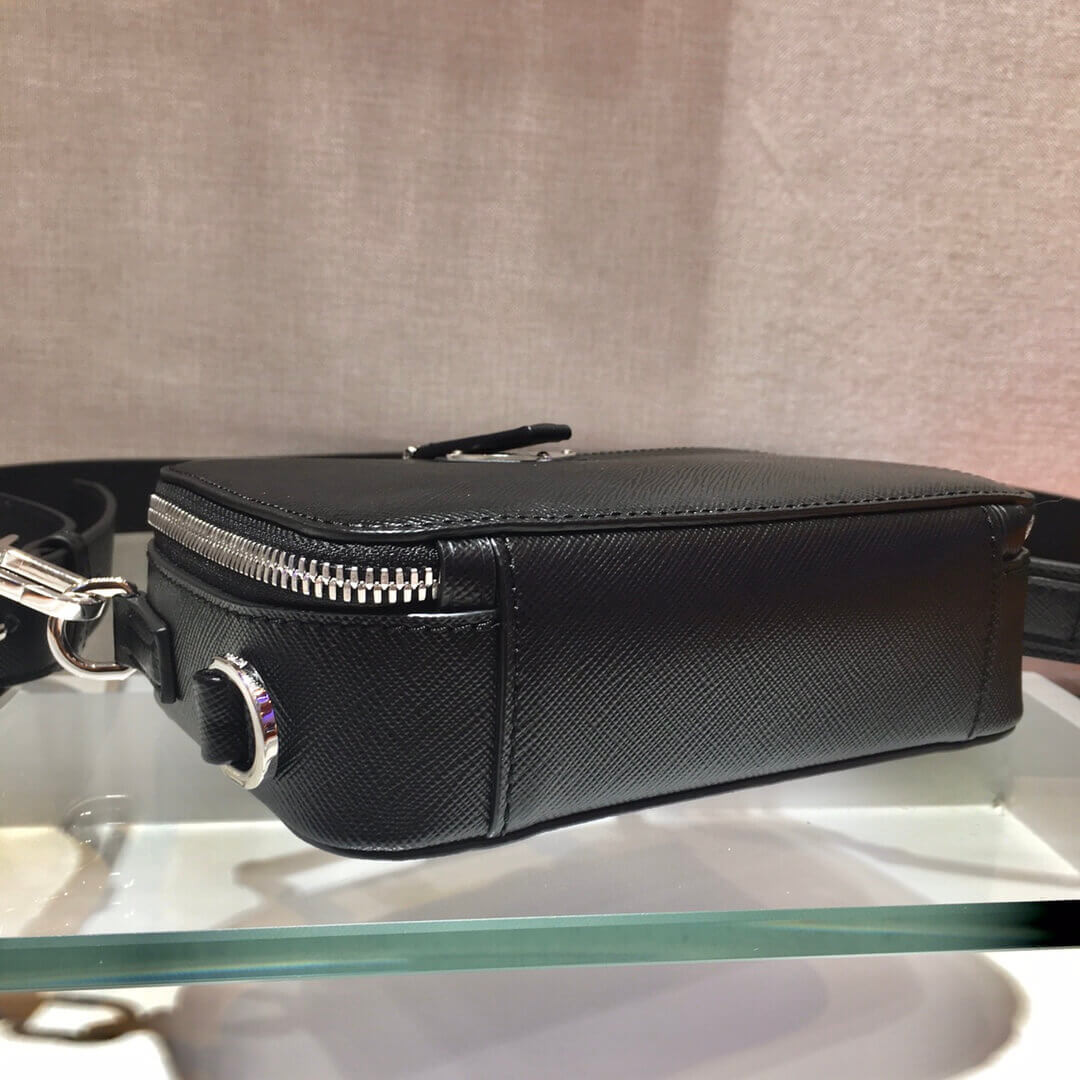 The elegant and modern Saffiano leather bandoleer bag has a shoulder strap and handle and is decorated with the metal triangle logo.