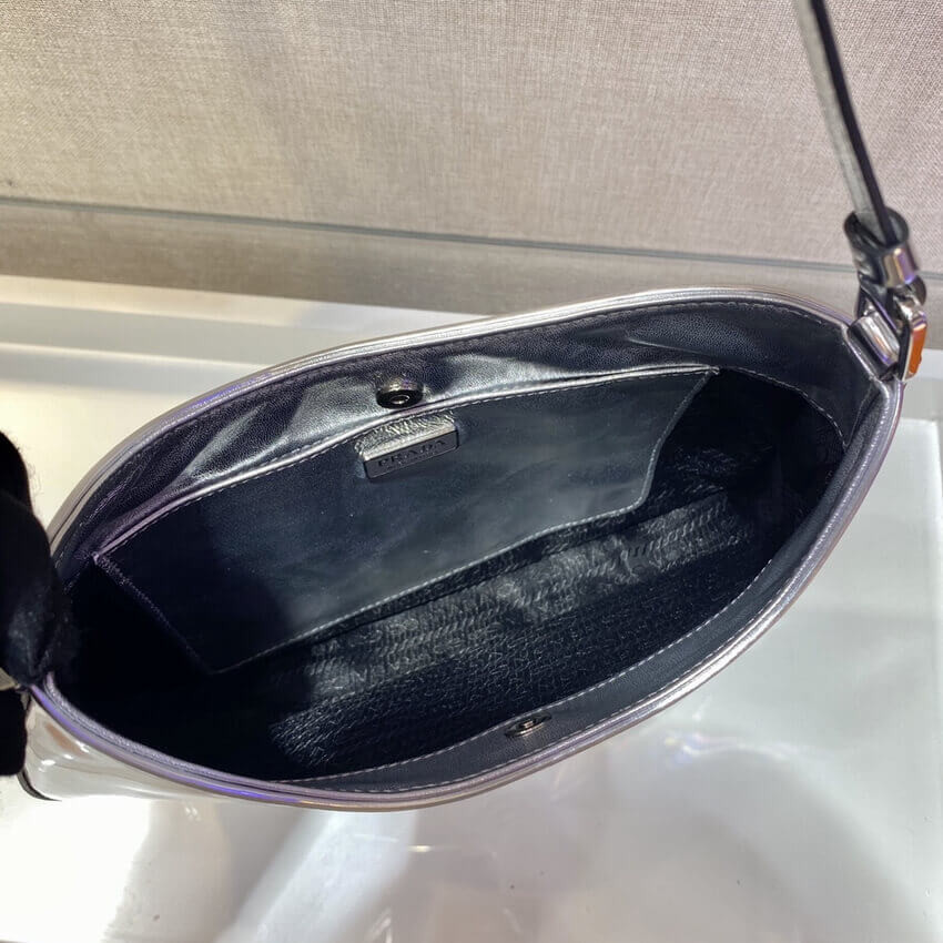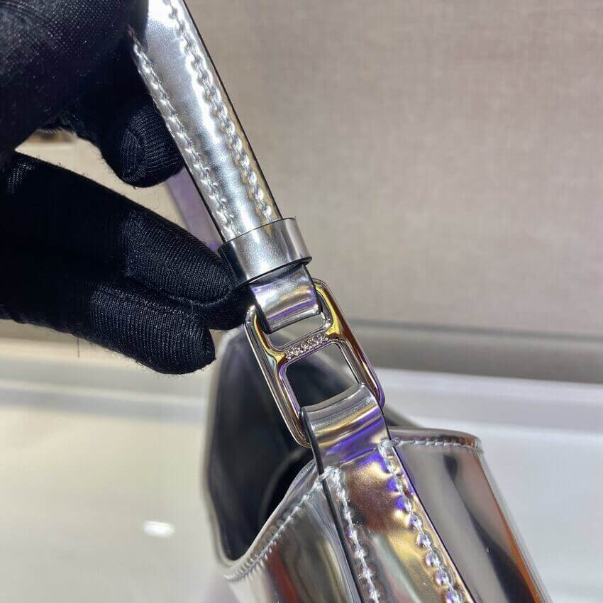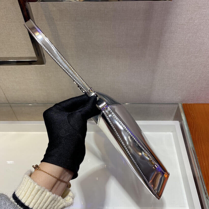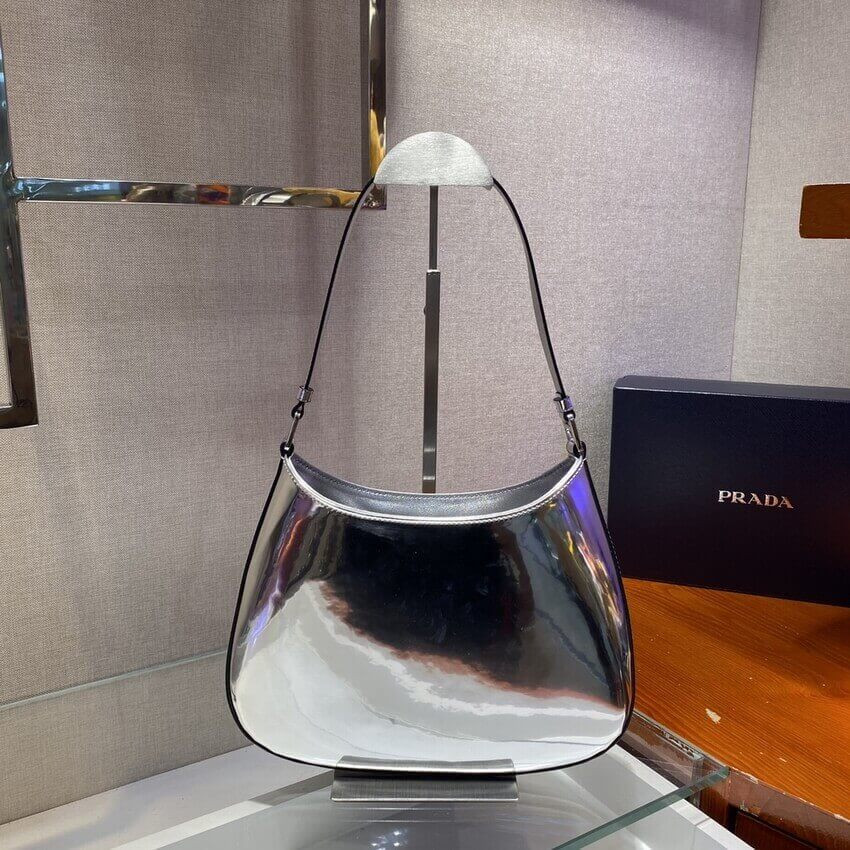 The Prada Cleo bag with sophisticated allure reinterprets an iconic design of the brand from the 1990's. Sleek curved lines emphasized by the particular construction rounded on the bottom and sides give this hobo bag a soft, light look. Brushed leather, a modern and versatile material that is distinctive in Prada collections, is ideal for creating always new combinations and contrasts. The enamel triangle logo decorates the silhouette.