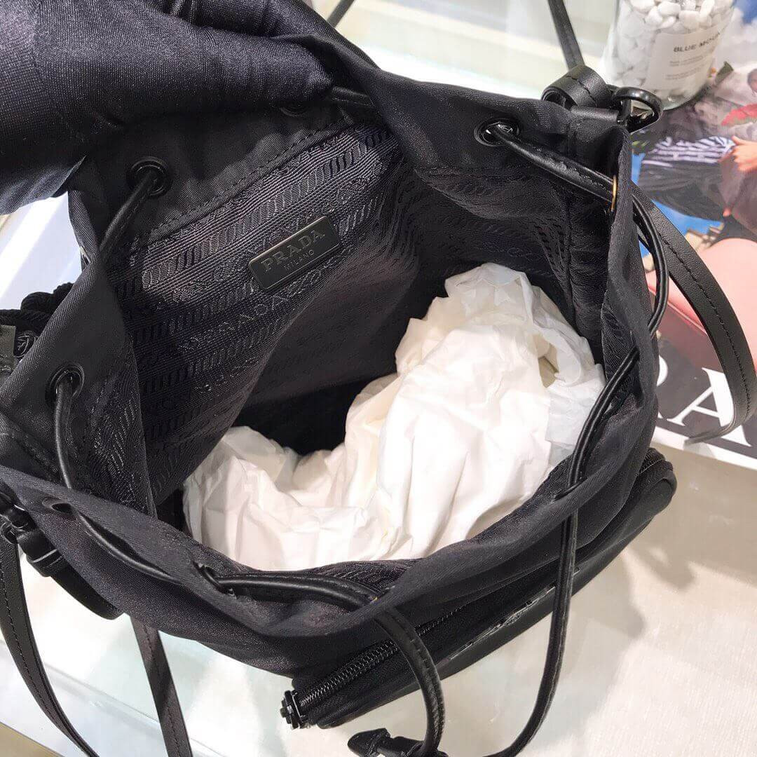 This bucket bag has a modern, feminine design. The Prada Duet bag stands out for its braided trim and nappa leather handle. The bag comes with a shoulder strap.