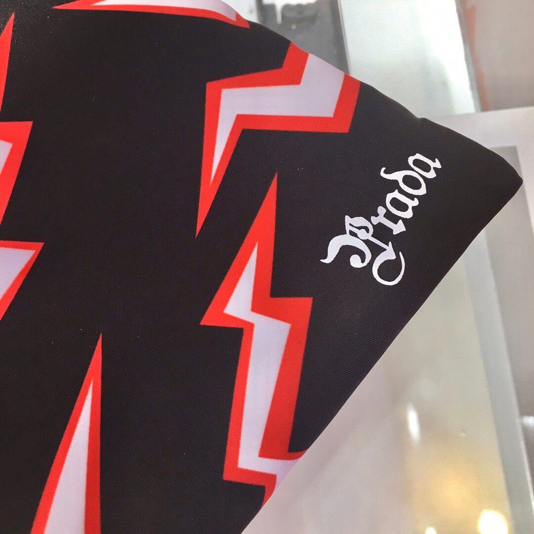 The Lightning print with a pop horror mood decorates this nylon handbag with double handle and detachable metal chain shoulder strap. The enameled metal triangle logo is distinctive.
