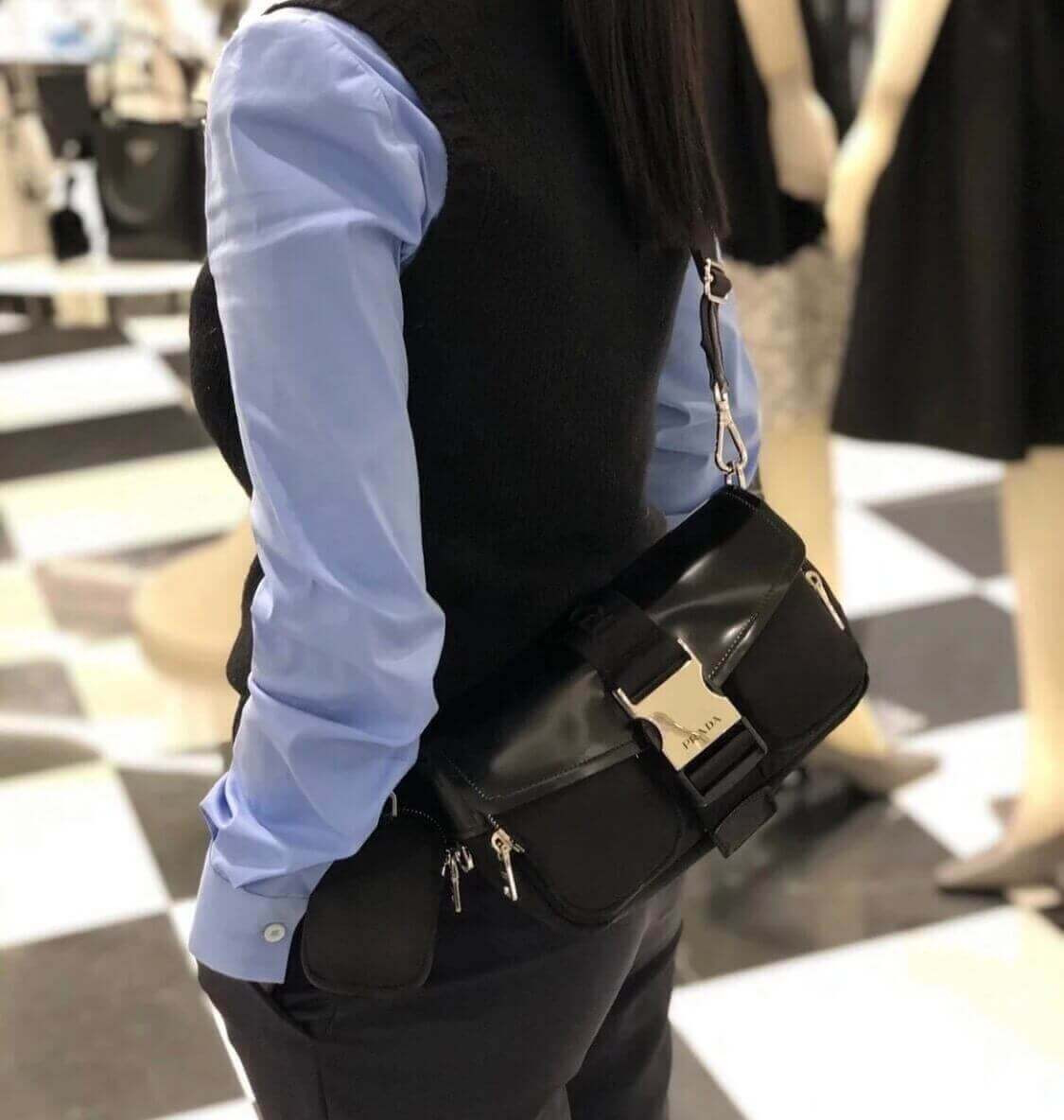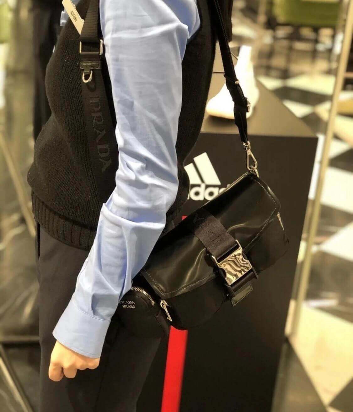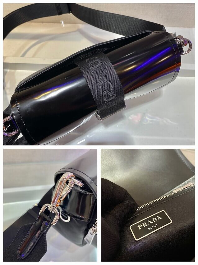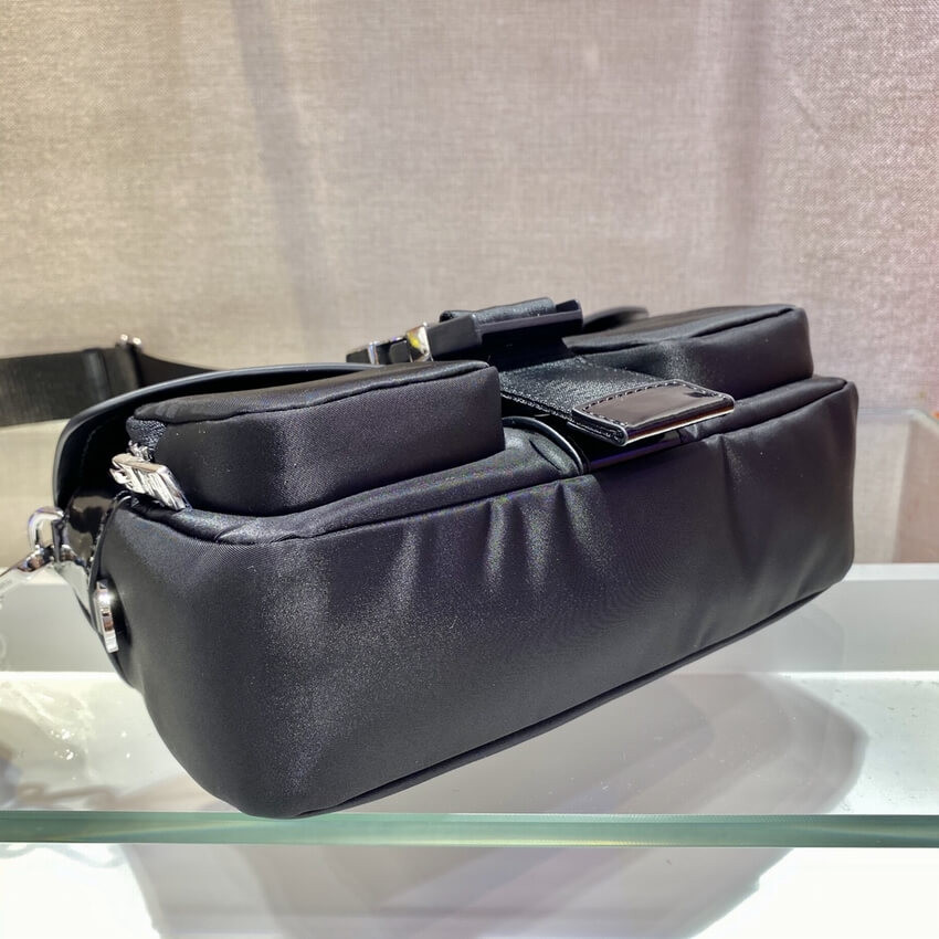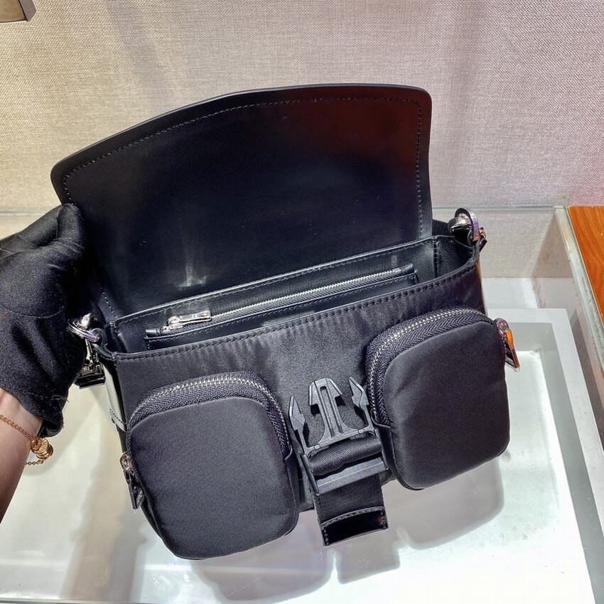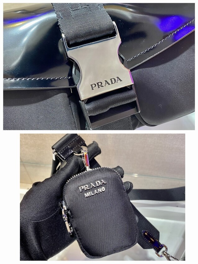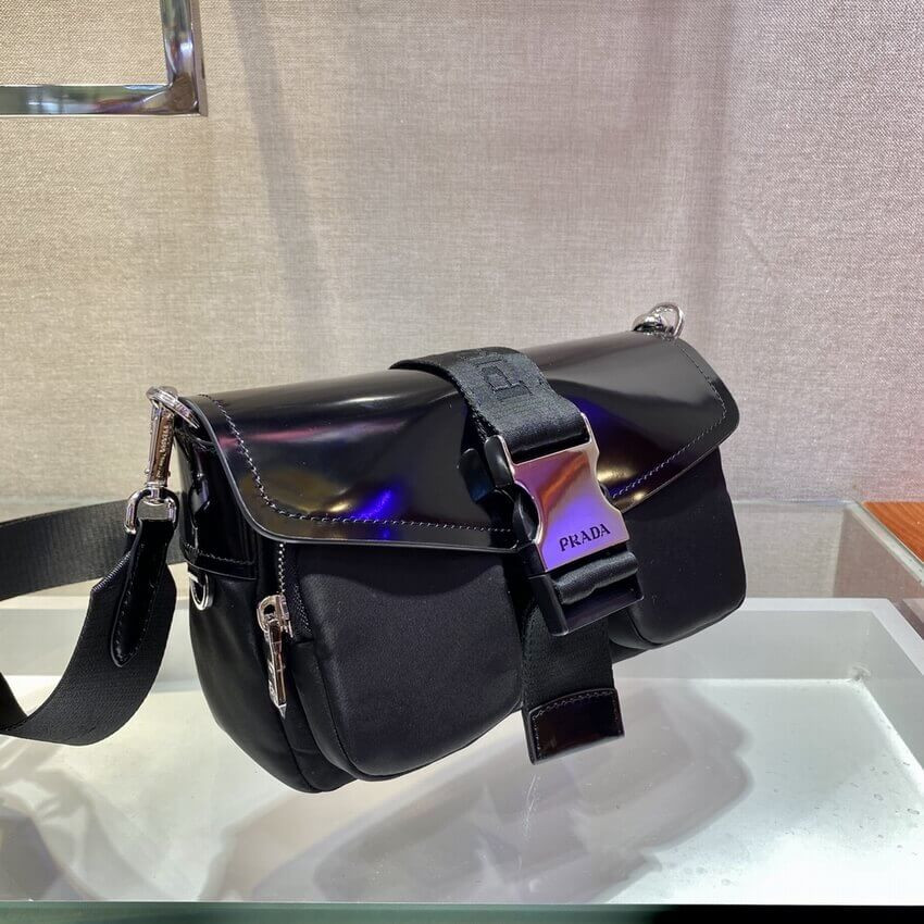 Sophisticated allure and technical-inspired details characterize this nylon and brushed leather shoulder bag. The accessory with adjustable shoulder strap is accented with a logo-engraved side-release buckle and lining in Re-Nylon, a regenerated nylon yarn produced from recycled and purified plastic trash collected in the ocean, fishing nets, and textile fiber waste.