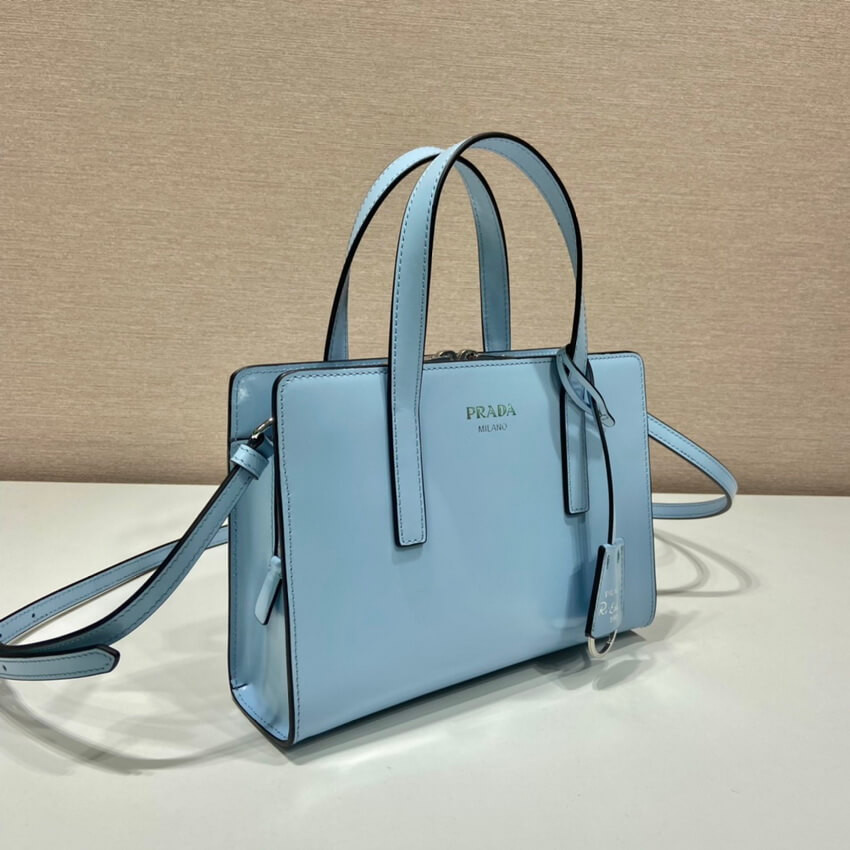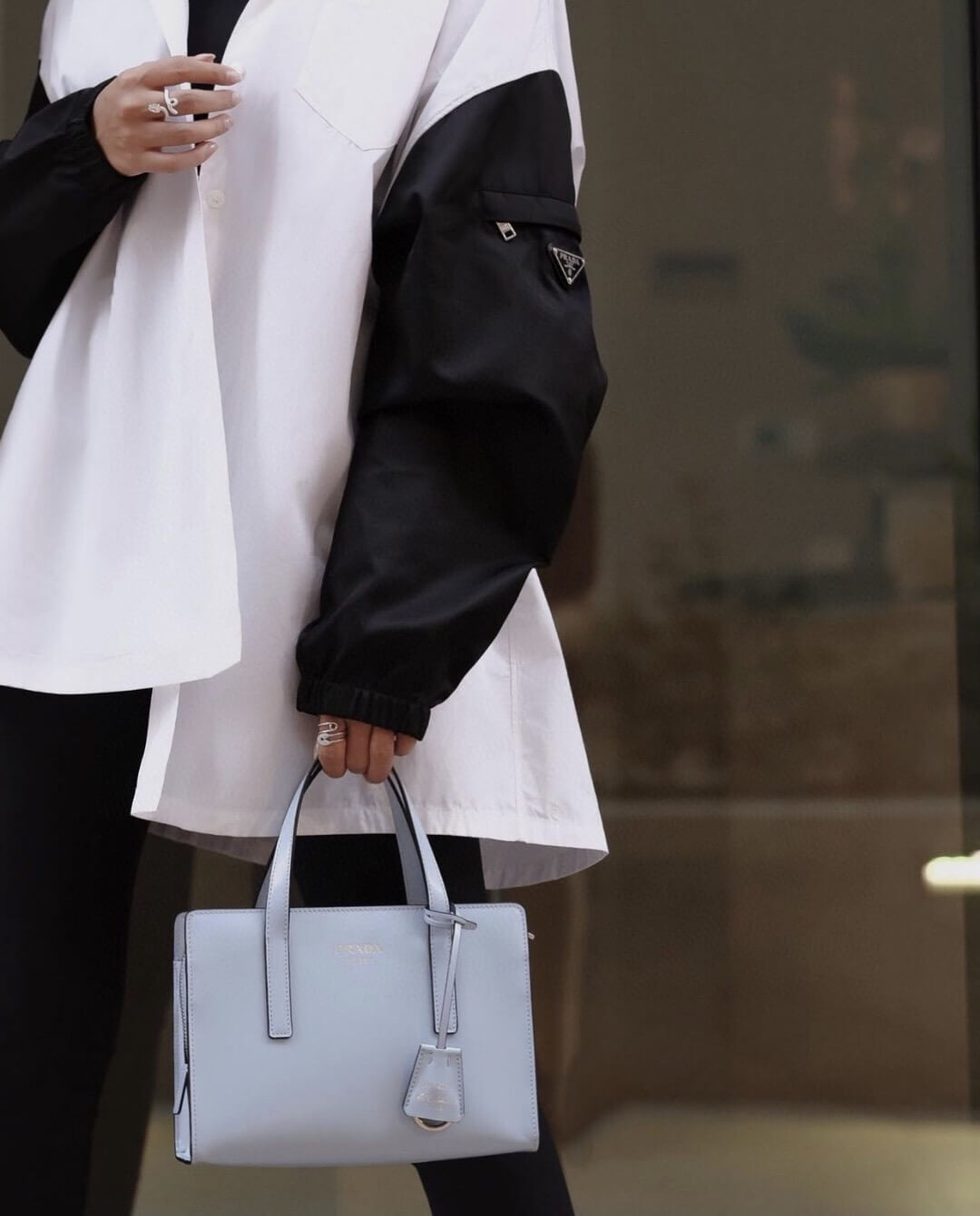 This handbag, a re-edition of an iconic Prada bag of 1995, is characterized by its elegant geometric silhouette with distinct, minimalist lines. Formal allure and practicality meet in its design with a central zipper closure, enhanced by the sophisticated accent of the screen-printed lettering logo. The accessory is made of fine brushed leather, an expression of the brand's expertise.