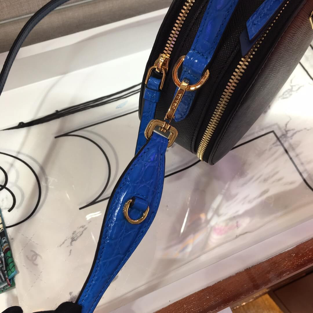 The design of the new Prada Odette bag made of Saffiano leather, carried by hand or worn as a shoulder bag, is inspired by camera cases worn by photographers and reporters. The rounded, minimalist lines of the bag are enhanced by fine crocodile leather trim.