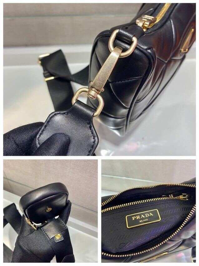 A patchwork-style triangle motif characterizes this shearling shoulder bag. Embellished on the front by the iconic enamel triangle logo, the multifunctional accessory comes with a removable nylon zipper pouch that attaches to the shoulder strap.