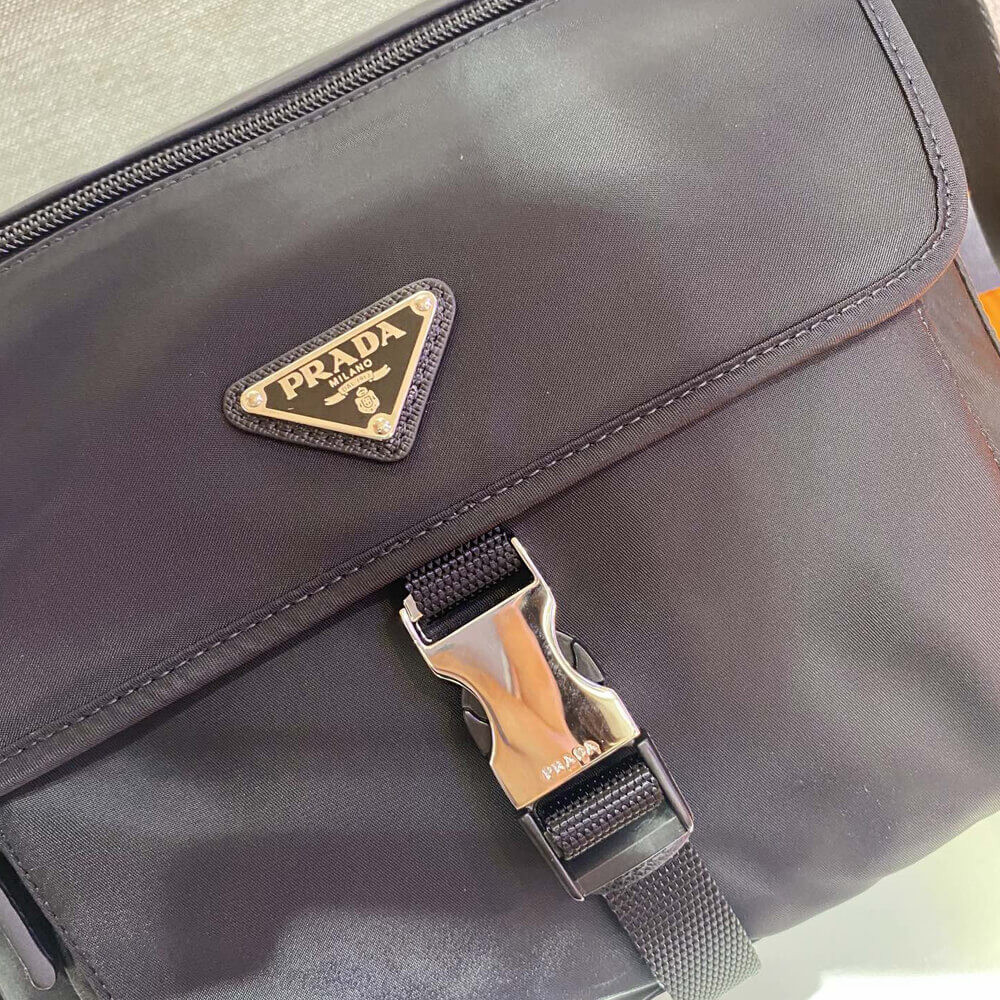 This fabric messenger bag features the Prada logo and steel buckle on the front. The piece is further embellished with Saffiano leather details and contains various pockets, inside and out, with logo lining throughout.