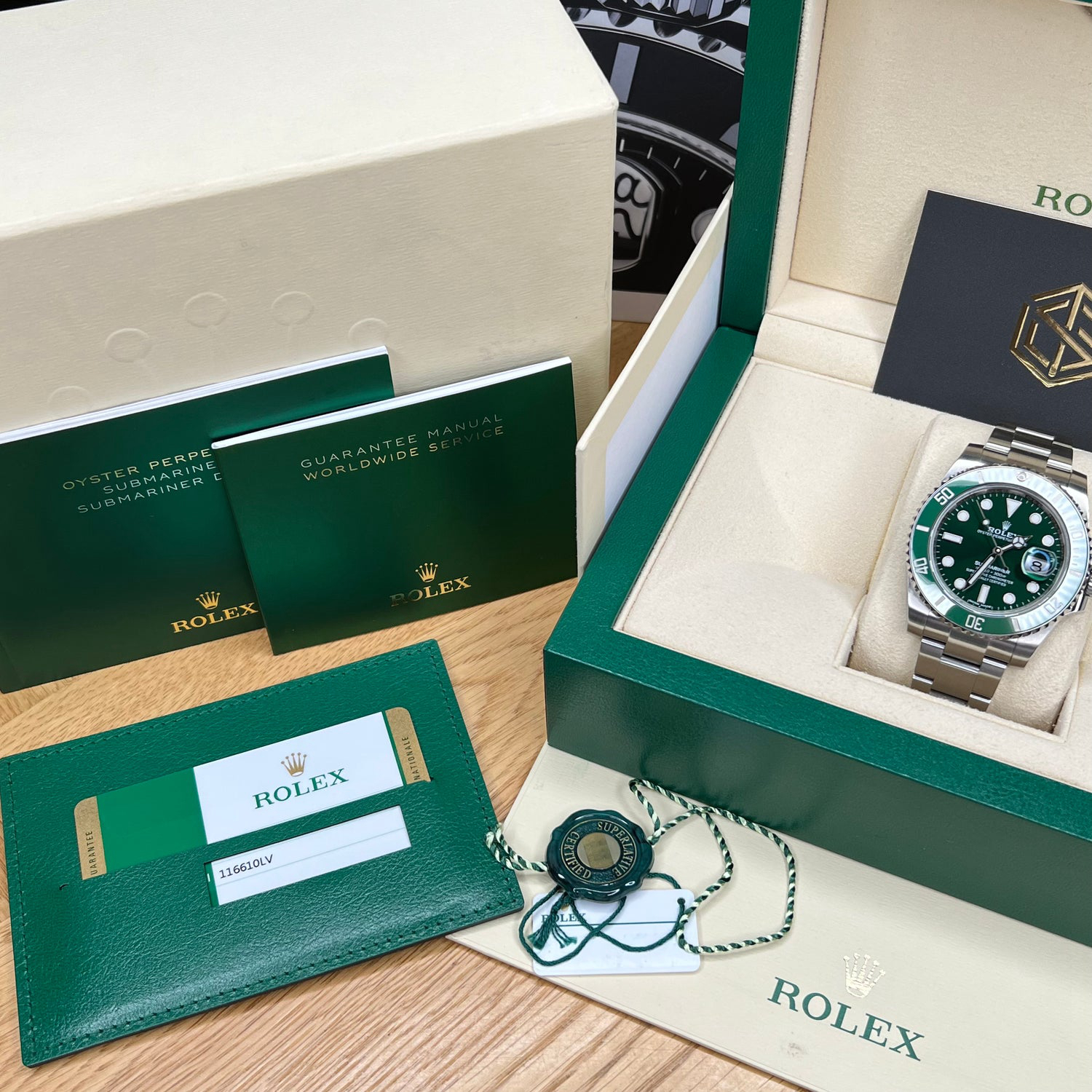 Brand new Rolex Submariner, Reference # 126610lv-0002, 41 mm. Oystersteel watch with all original accessories, original Rolex box, and Rolex Warranty Card.