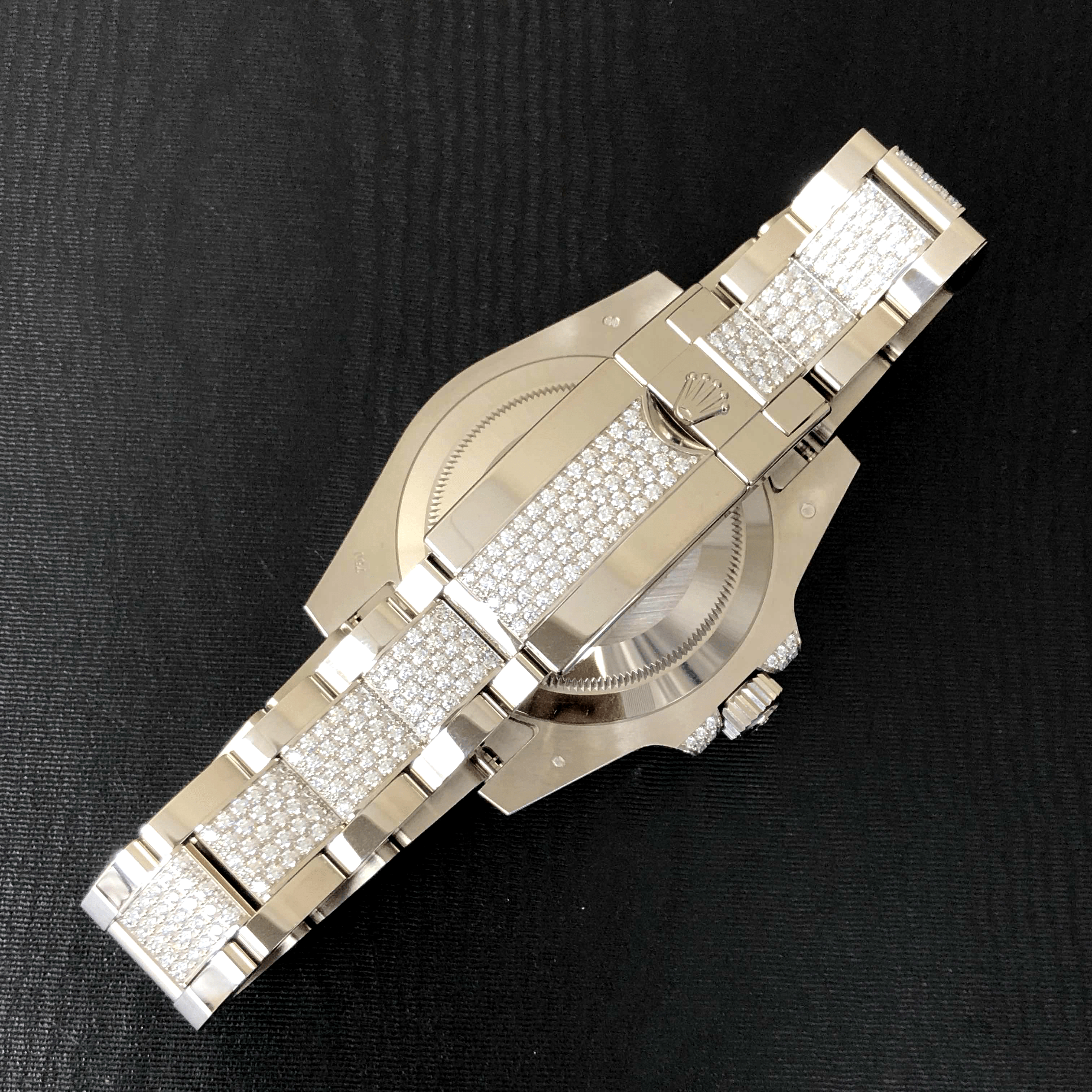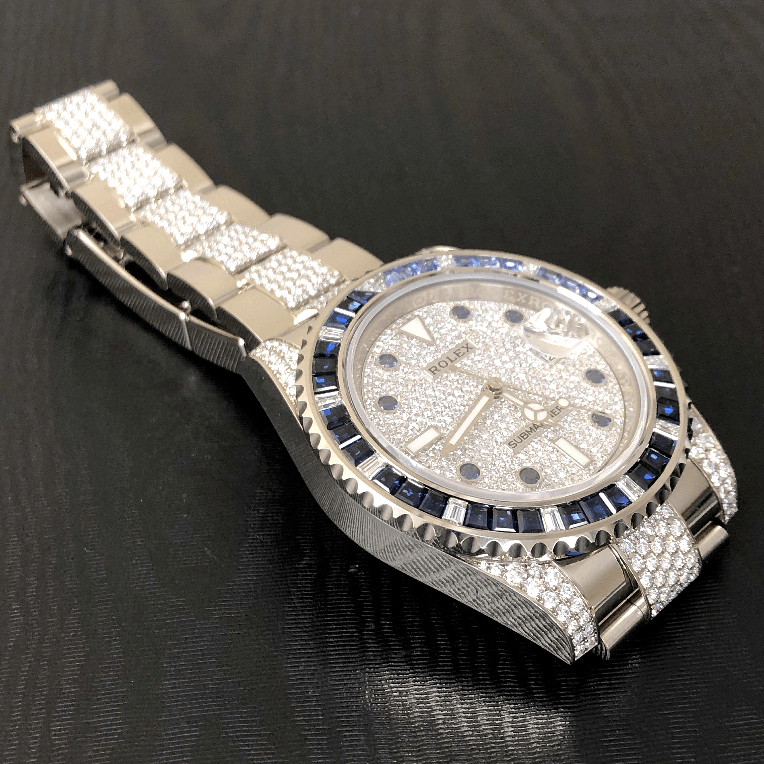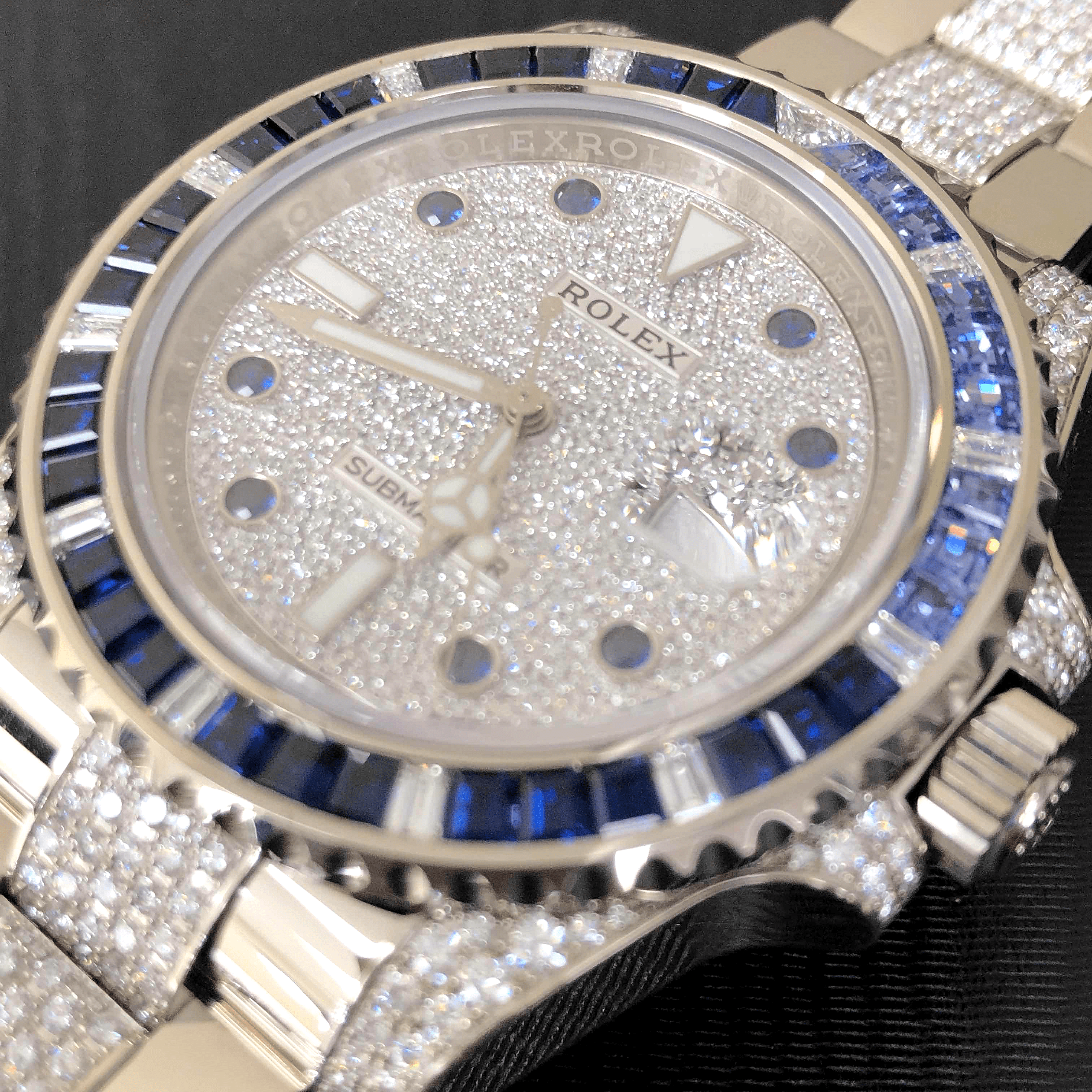 This is an 18K white gold Rolex Submariner 116659SABR. t includes an integral Rolex 18K white gold Oysterlock bracelet with a folding deployment clasp and a scratch resistant sapphire crystal. It has a screwed down solid case back and Triplock winding crown protected by diamond set crown guards. The solid three-body 40 mm. diameter case, straight diamond set lugs, bracelet and flat knurled bezel, are polished and brushed. The graduated unidirectional revolving bezel is white gold and set with 27 b aguette cut sapphires, and 11 baguette cut diamonds every 10 minutes, the dive triangle at the 60-minute position is set with a triangular diamond. It has a sunburst blue dial with luminous white gold-set dot, baton, and arrow hour index markers, luminous white gold "Mercedes" style Rolex minute and hour hands, a center sweep second hand with a luminous "lollipop" indicator, a white minute/second perimeter chapter ring, and a cyclops magnification lens for the date aperture window at 3 o'clock. It's water resistant to 330 meter/1,000 feet, it has a 48-hour power reserve at full winding, and the 13mm thick case, dial, and movement are all signed.