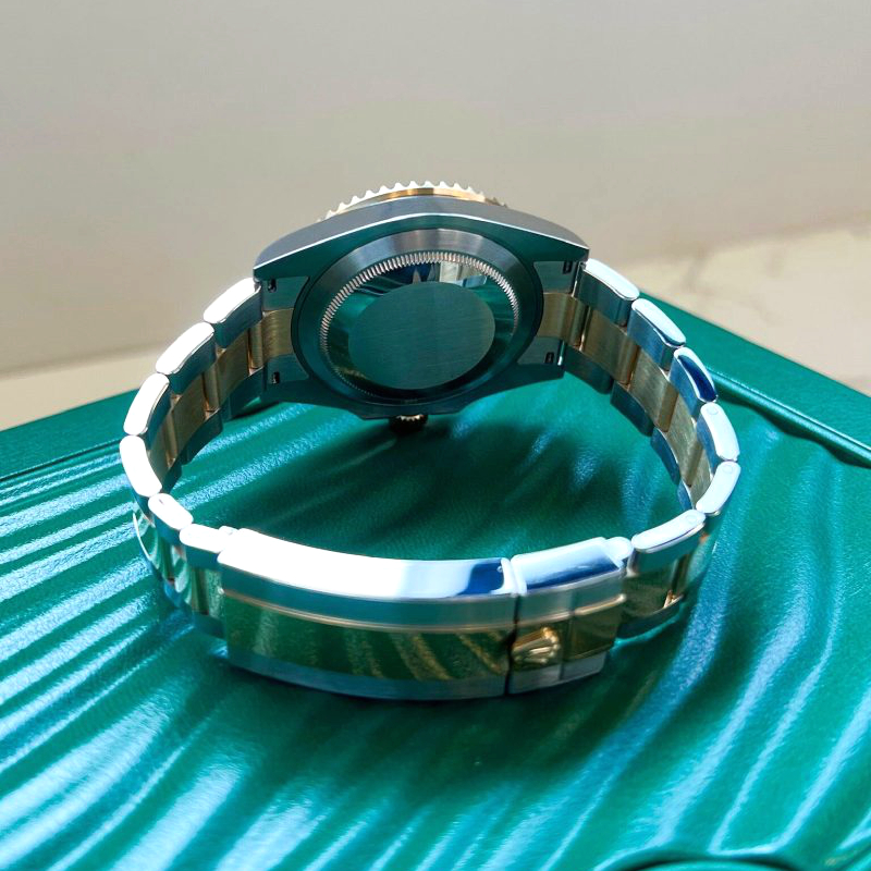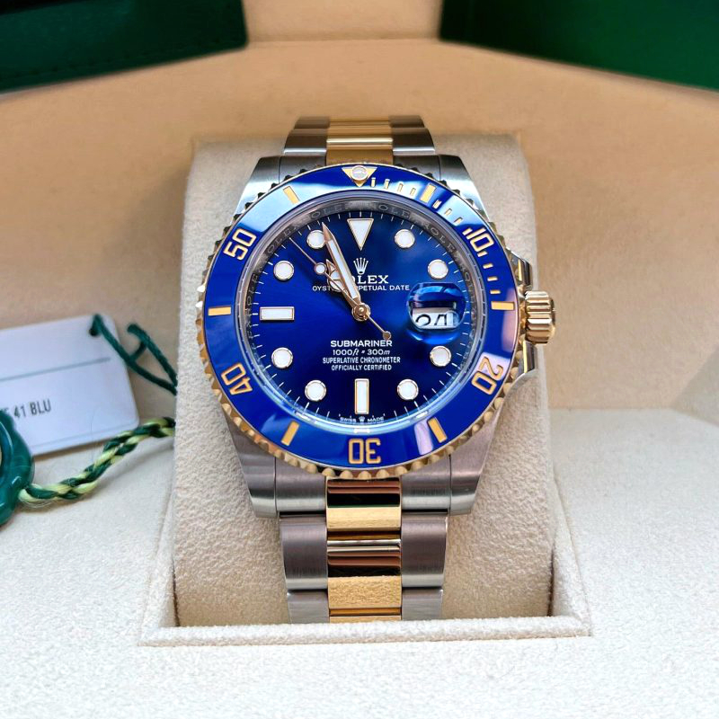 Rolex Submariner Date, 41mm watch of polished Stainless Steel and 18k Yellow Gold. This model has blue dial with a polished 18k Yellow Gold hour, minute and seconds hands in Mercedes-logo and Breguet-style sword shape with luminous fill. Applied polished 18kt Yellow Gold rimmed doty and index hour markers with luminous fill. Fine printed minute/seconds track on the dial rim. Highly legible Chromalight display with long-lasting blue luminescence. Polished 18kt Yellow Gold patented "Triplock" locking crown ensuring that the crown screws down onto the Oyster case as securely as a submarine hatch. The dial closed by a Scratch-resistant Sapphire Crystal and solid case back made. The Watch has Centre hour minute and seconds hands. Stop-seconds for precise time setting. Date window at 3 o'clock with a cyclops magnifier. The watch is equipped unidirectional rotatable polished 18k Yellow Gold bezel with knurled corners for enhanced grip. Blue "Cerachrom" bezel insert, made of ceramic which is extremely hard, durable and highly scratch-resistant. Ceramic has excellent corrosion resistant properties and is unaffected by ultraviolet rays so the color will not fade. It features a 60-minute immersion scale engraved in yellow gold with a luminous point at the origin. The movement is mechanical self-winding 3235, containing 31 Jewels and 70 hours of power reserve. The Rolex Oyster bracelet of brushed outer links Stainless Steel and polished center links 18k Yellow Gold with folding Oysterlock safety clasp with Rolex Glidelock extension system. The water resistance is up to 300 meters/1000 feet.