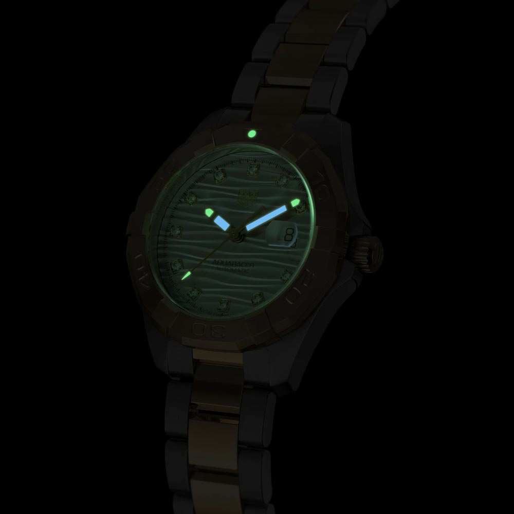 This professional silver-dial sports watch is glamorized with 18ct yellow-gold plate and 11 sparkling diamonds (0.107 CT) on its lacquered silver dial. Internally powered by Calibre 9 automatic movement. it has total water-resistance to 300 meters.