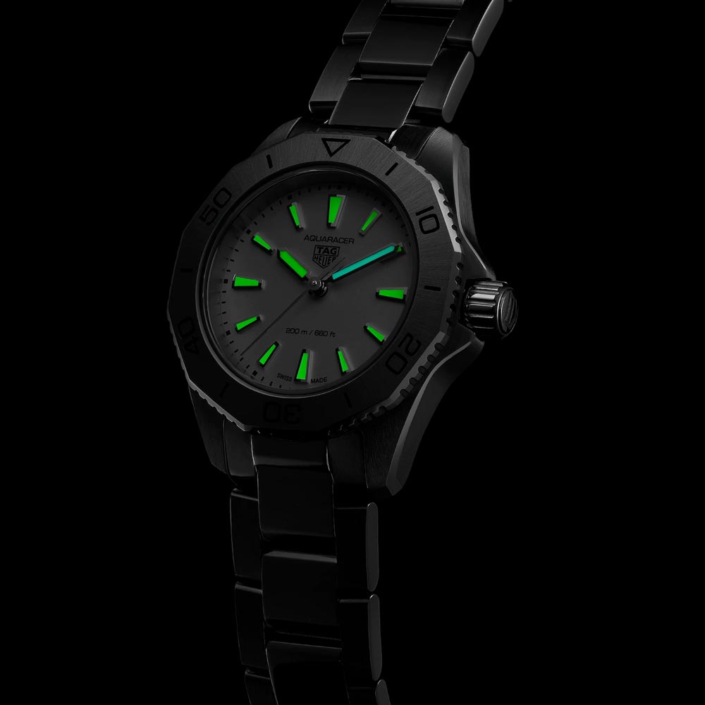 The TAG Heuer Aquaracer is built for everyday use. A true tool watch with versatile style. ready to help you overcome your personal limits. This 30mm model stands out with a shimmering silver dial and unmistakable boldness.