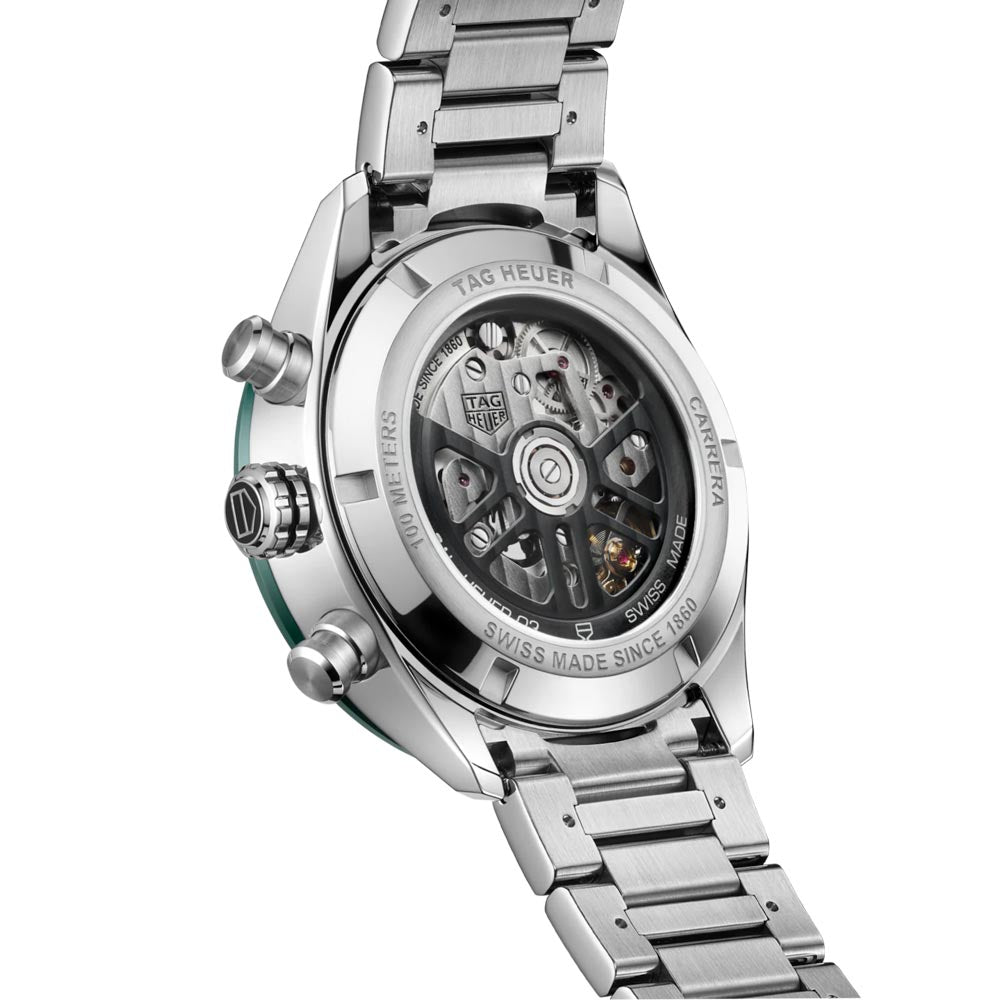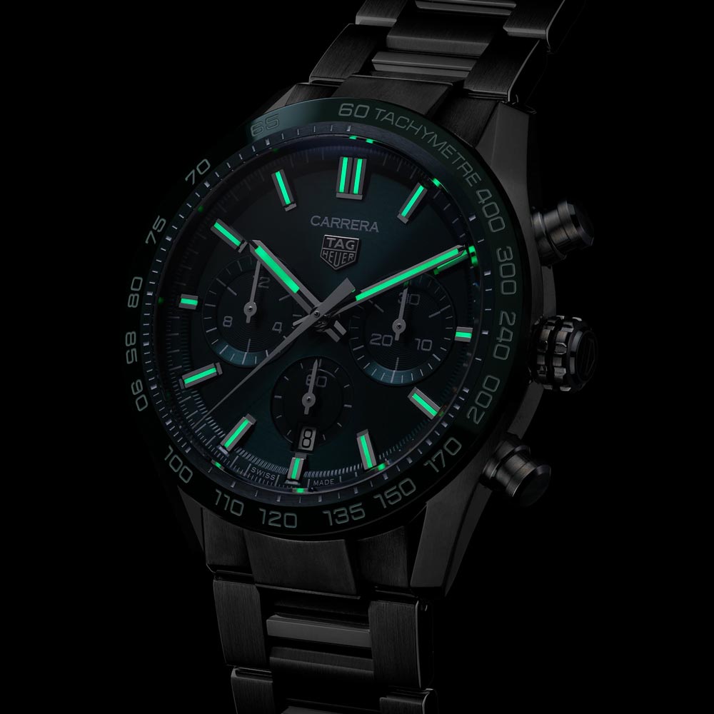 This TAG Heuer Carrera showcases a fashionable appeal through its alluring green dial and complementary ceramic bezel. Its sporty design and singular hue accentuate the watch's readiness for all kinds of adventures. all driven by the acclaimed in-house Calibre Heuer 02 movement.