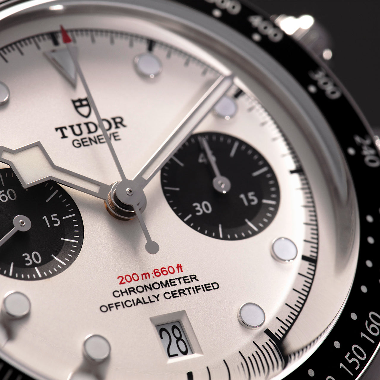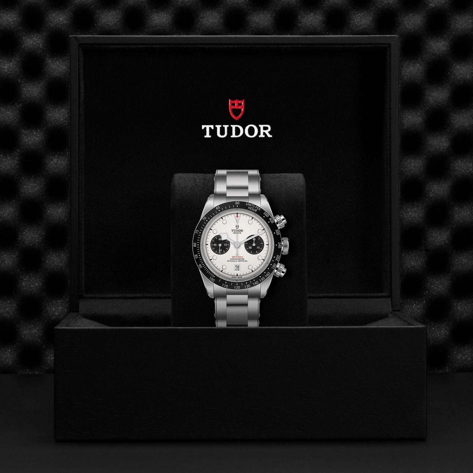 The hybrid Black Bay Chrono combines the heritage of divers' watches represented by the Black Bay family with the queen of the racetrack. the chronograph. The characteristics of the Black Bay collection are preserved in a steel case fitted with pushers inspired by the first generation of TUDOR chronographs. A fixed bezel with an engraved tachymetric scale completes the face of this sporty chronograph.