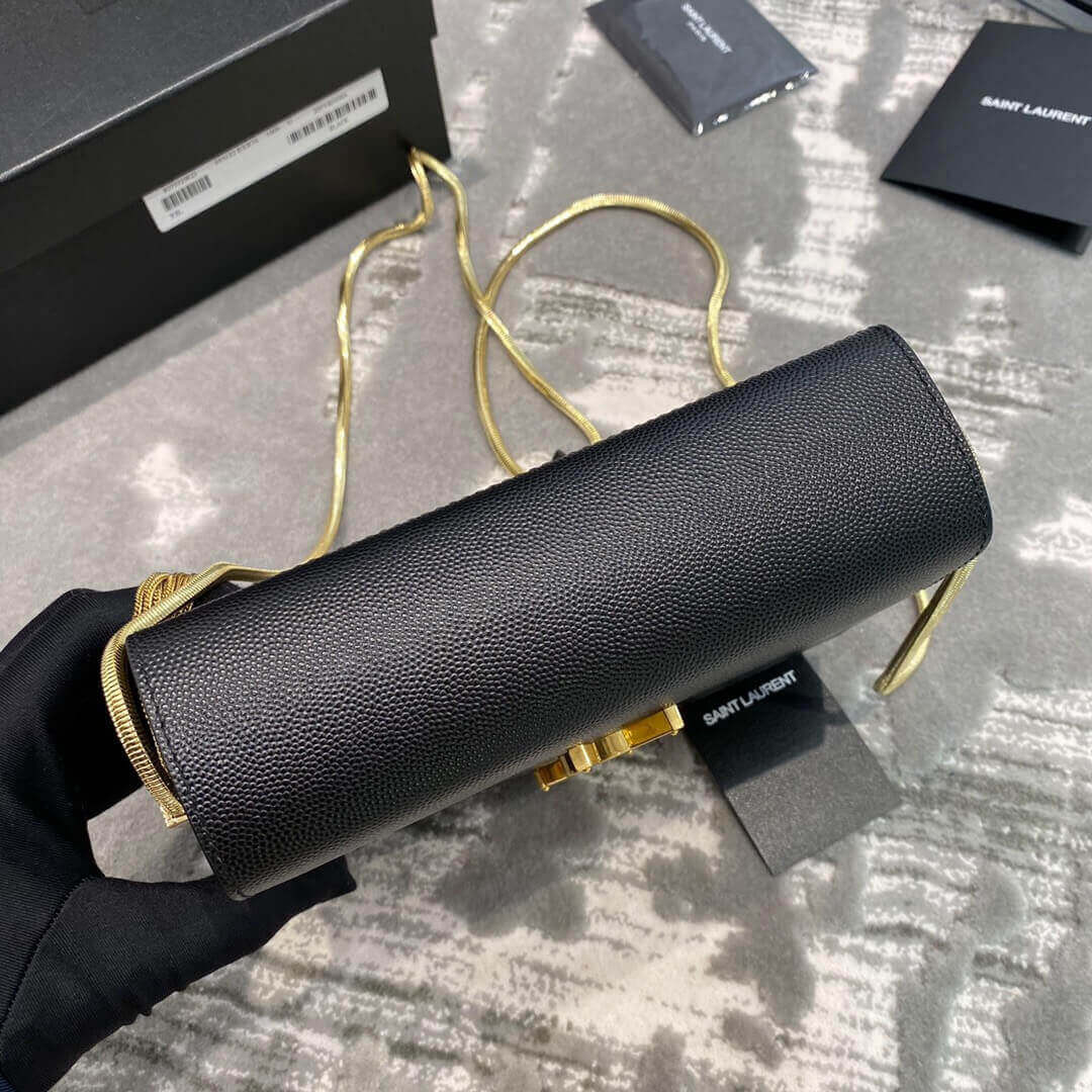 Saint laurent monogram box bag with flap decorated with metal ysl initials and featuring a square omega chain shoulder strap with tassels.